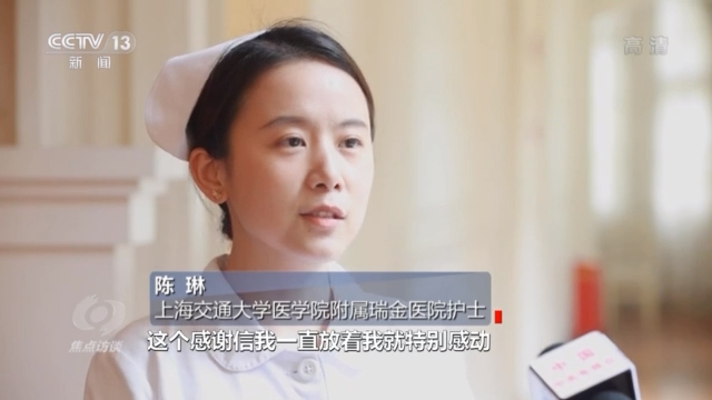 上海交通大学医学院附属瑞金医院护士 陈琳:感谢信上面最后他写道,他说这个世上没有救世主,是你们在人间创造奇迹。这个感谢信里面其实也描绘了平常我们工作中对他的点点滴滴的护理,我们对他的鼓励,包括我们对他的宽慰,平常对他的治疗。这个感谢信我一直放着,我就特别感动。