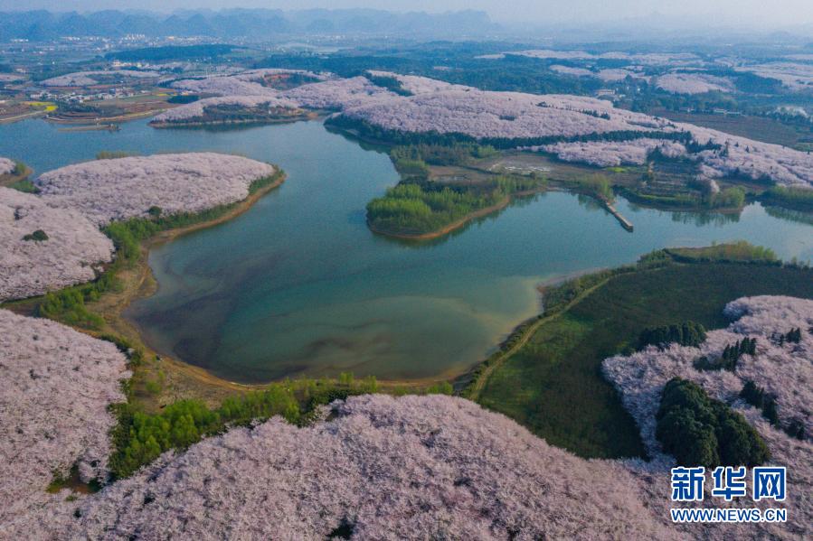 近日,贵州省贵安新区红枫湖畔的樱花观光园内万亩樱花竞相盛开,吸引不少游客前来观赏。
