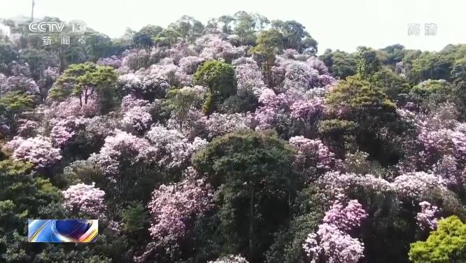 春意盎然的三月,深圳罗湖的梧桐山上的毛棉杜鹃争相绽放。登高远眺,漫山阔叶林成片延伸,粉红色的花团嵌在其间形成花海,春风拂过山林,一树树毛棉杜鹃也随之翻涌成浪。