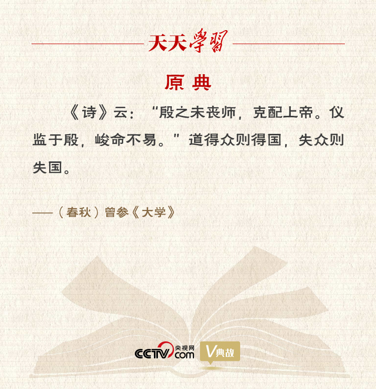《大学》多次引用并阐释《诗经》中的诗句。原典中的“殷之未丧师,克配上帝。仪监于殷,峻命不易”出自《诗经·大雅·文王》。丧师:失去民众;仪:当作“宜”;峻命:大命,即天命。这句话意思是说,商没有失去民心的时候,还能与天意相称。我们应该以殷商为戒鉴,天命才不会变更。进而得出如下结论:“道得众则得国,失众则失国。”道:指治国的道理。意谓得到民众的拥戴就能得到整个国家,失去民众的拥护就会失去整个国家。这句话与孟子的“得道者多助,失道者寡助”一样,都阐述了民心向背关乎国家兴亡的道理。