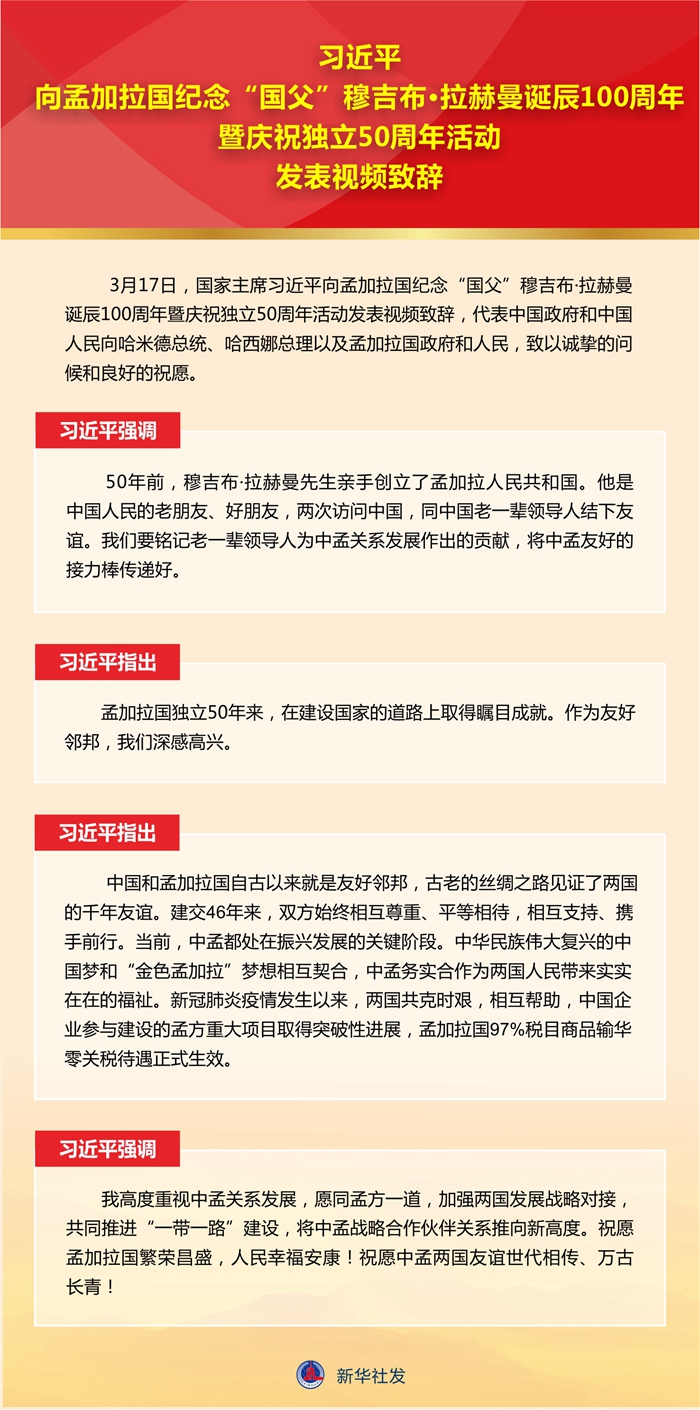 习近平向孟加拉国纪念“国父”穆吉布·拉赫曼诞辰100周年暨庆祝独立50周年活动发表视频致辞