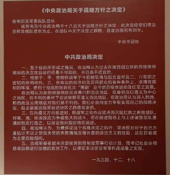 会议从白天开到深夜,争论十分激烈。最终,与会多数同志接受了毛泽东同志“向黔西北进军”的正确主张,通过了根据他的发言写成的《中央政治局关于战略方针之决定》。