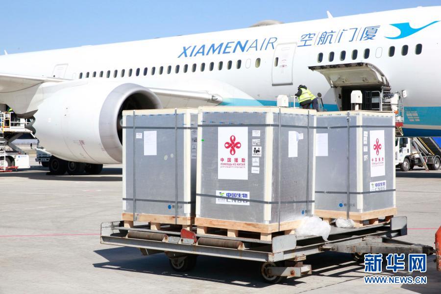 中国政府援助吉尔吉斯斯坦政府新冠疫苗19日运抵比什凯克。吉总理马里波夫与中国驻吉大使杜德文在比什凯克玛纳斯国际机场共同出席疫苗交接仪式。新华社发(罗曼摄)
