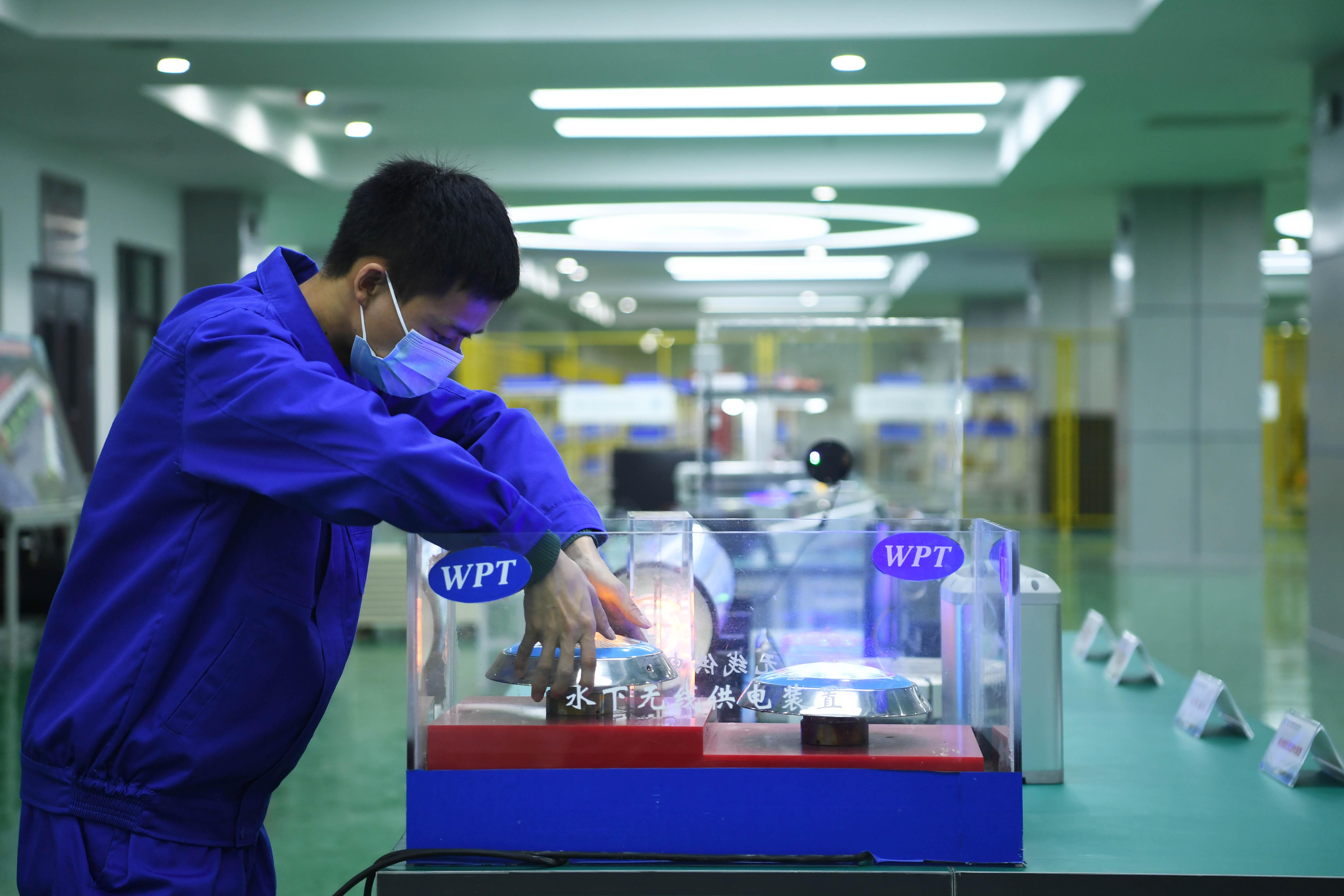 △重庆一科技企业的工作人员正在测试水下无线供电装置。