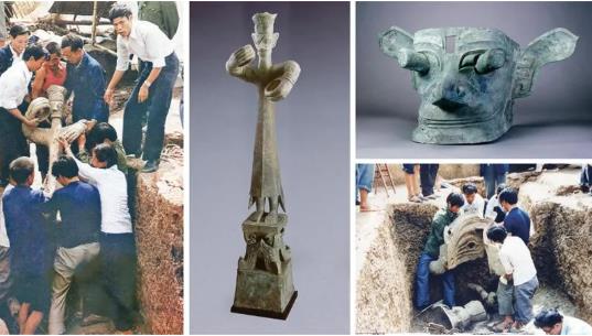 图为1986年三星堆遗址一、二号祭祀坑发掘现场,以及出土的铜大立人像和铜纵目面具。
