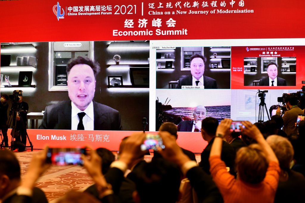 3月20日,特斯拉公司首席执行官埃隆·马斯克通过视频连线方式在中国发展高层论坛2021年会经济峰会上发言。新华社记者 李鑫 摄