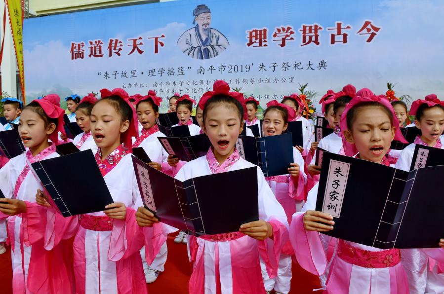 2019年10月18日,小学生在福建省建瓯市举行的朱子祭祀大典上诵读《朱子家训》。新华社记者 张国俊 摄