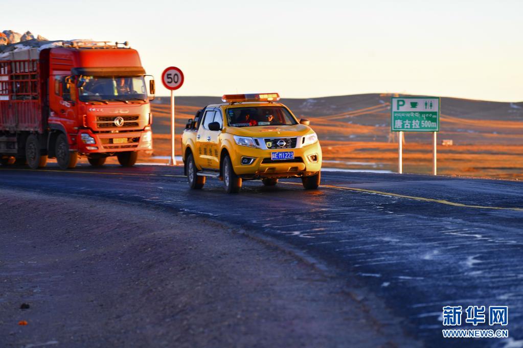安多公路养护段巡护车和一辆货车行进在国道109唐古拉山口路段(1月13日摄)。新华社记者 张汝锋 摄