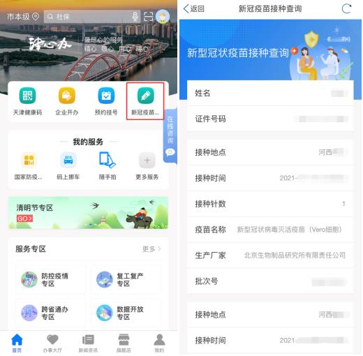 “津心办”、天津“健康码”均可查新冠疫苗接种记录