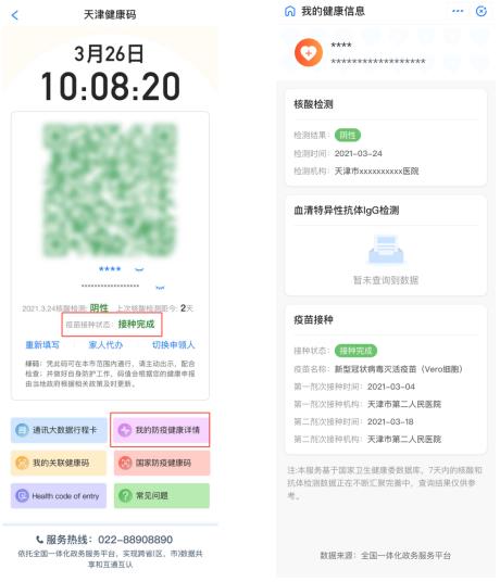 在“津心办”三端天津“健康码”亮码页面下方,新冠疫苗接种者的疫苗接种状态就可一目了然。点击下方的“我的防疫健康详情”,则可显示本人7日内的核酸和抗体检测结果、新冠疫苗接种状态和详细的接种剂次、时间和机构等信息。