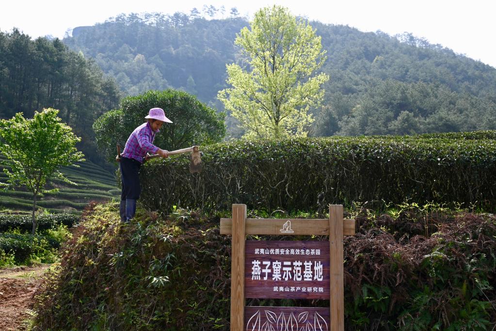 2021年3月23日,茶农在武夷山星村镇燕子窠生态茶园除草。新华社记者姜克红摄