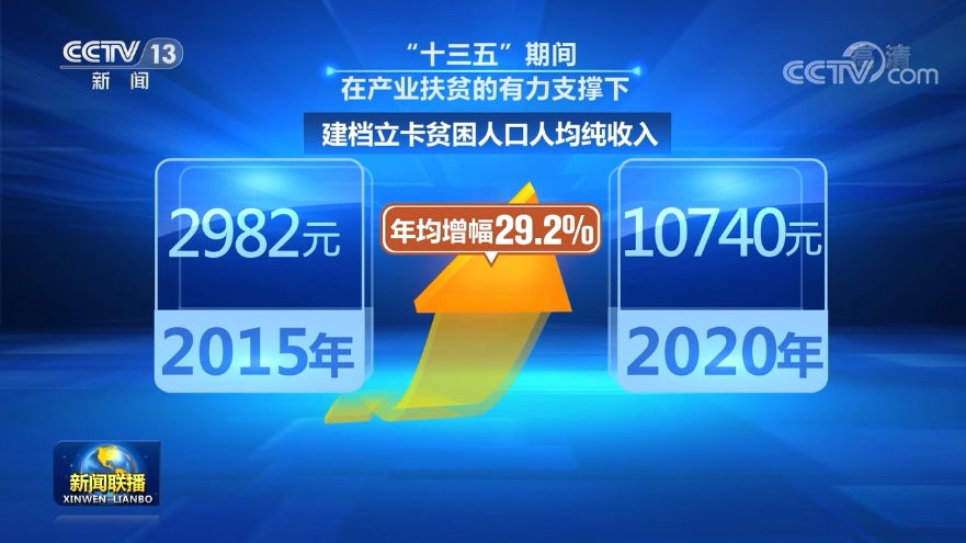 “十三五”期间,在产业扶贫的有力支撑下,建档立卡贫困人口人均纯收入由2015年的2982元,增加到2020年的10740元,年均增幅29.2%。
