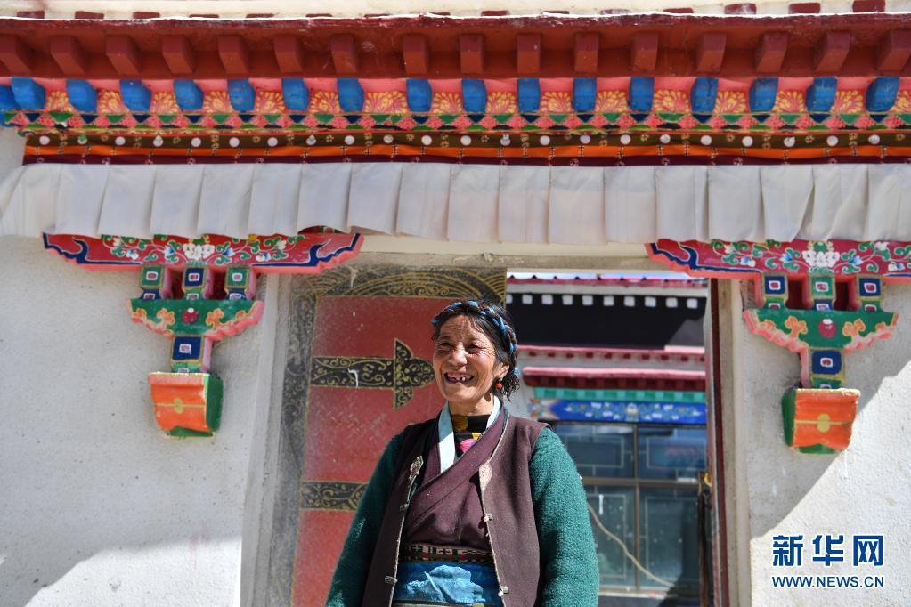 在海拔5373米的西藏浪卡子县普玛江塘乡,一名当地妇女站在新建成的边境小康村“小康房”门前(2020年4月15日摄)。新华社记者 晋美多吉 摄
