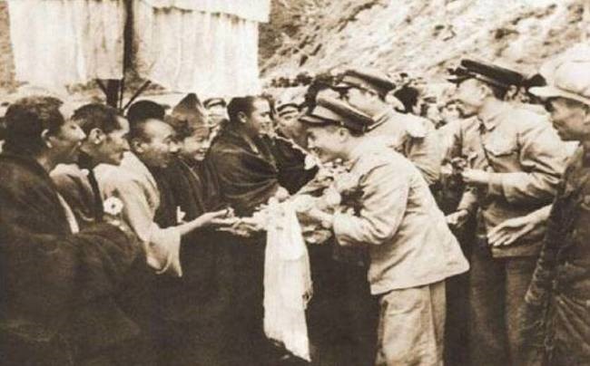 △进藏解放军受到西藏人民的欢迎