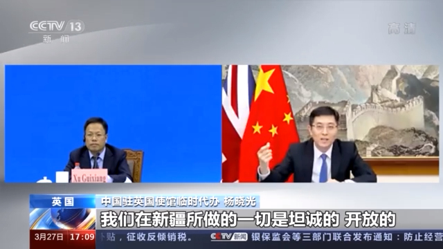 中国驻英国使馆临时代办 杨晓光:有些国家,包括英国,甚至推出所谓制裁,中方对此坚决反对,绝不接受。中方不惹事,也不怕事,我们不主动挑起对抗,但如果有人执意对抗,中方只有奉陪到底。我们诚挚地希望英国民众能够抛开成见,不偏听偏信,传播谎言,为增进中英相互了解,促进两国关系健康发展多做贡献。