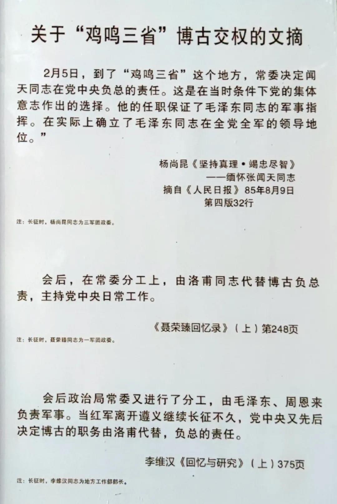 “从土城战斗渡了赤水河。我们赶快转到三省交界即四川、贵州、云南交界地方,有个庄子名字很特别,叫‘鸡鸣三省’,鸡一叫三省都听到。就在那个地方,洛甫才做了书记,换下了博古。”
