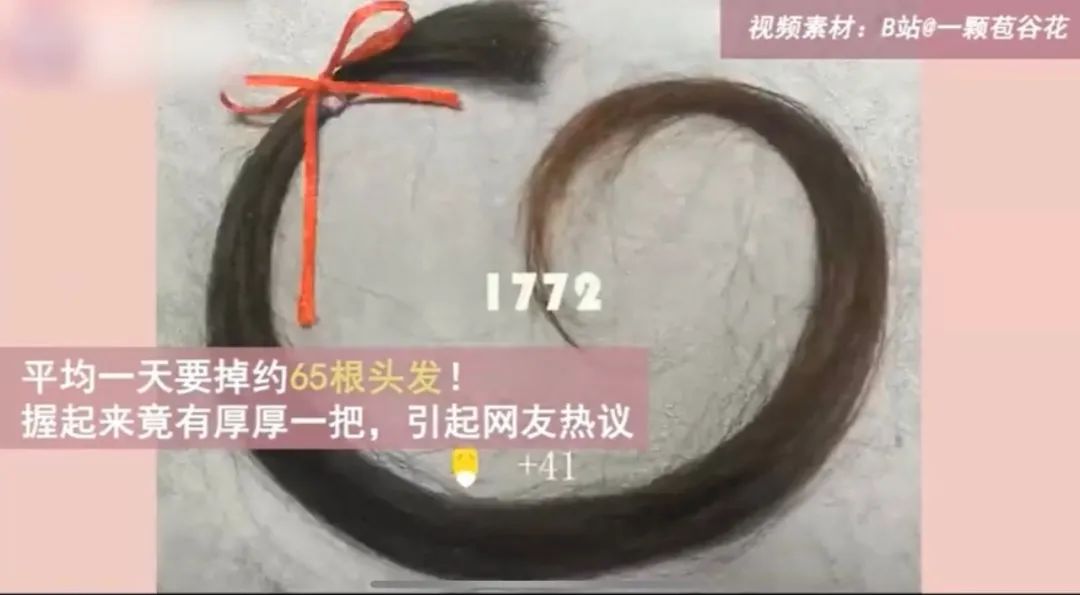 近日,网友@一颗苞谷花把每天掉的头发积累起来,用视频记录了从2020年3月14日,至2021年3月13日之间,掉落头发数量的变化过程,冲上热搜。一年下来积累了共23748根掉发,平均下来一天要掉约65根头发,网友笑称“很遗憾以这种秃然的方式认识你”。 脱发已经成为很多年轻人饱受困扰的问题,相关话题常常占据网络话题热榜。医生表示要想保护好自己的头发,保持一个健康的生活方式是最重要的,平衡饮食,健康心态,合理作息,不要长时间使用电脑,不要熬夜,避免过度节食减肥。