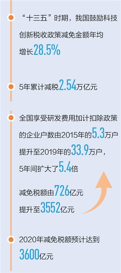 为营造良好的科技创新税收环境,“十三五”期间,我国逐步推进研发费用加计扣除政策调整优化,推出大幅放宽研发活动和研发费用范围、分两步将研发费用的加计扣除比例从50%提升至75%、允许企业委托境外研发费用加计扣除等措施。数据显示,全国享受研发费用加计扣除政策的企业户数由2015年的5.3万户提升至2019年的33.9万户,5年间扩大了5.4倍;减免税额由726亿元提升至3552亿元,2020年预计达到3600亿元。