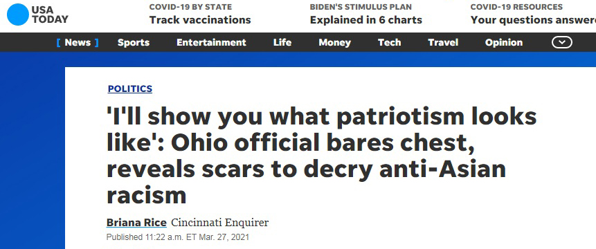 △《今日美国报》网站报道,俄亥俄州的官员展示胸部伤痕谴责美国歧视亚裔。