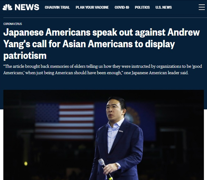 △美国全国广播公司网站2020年报道,日裔美国人反对杨安泽呼吁的“亚裔应展现出爱国主义”。