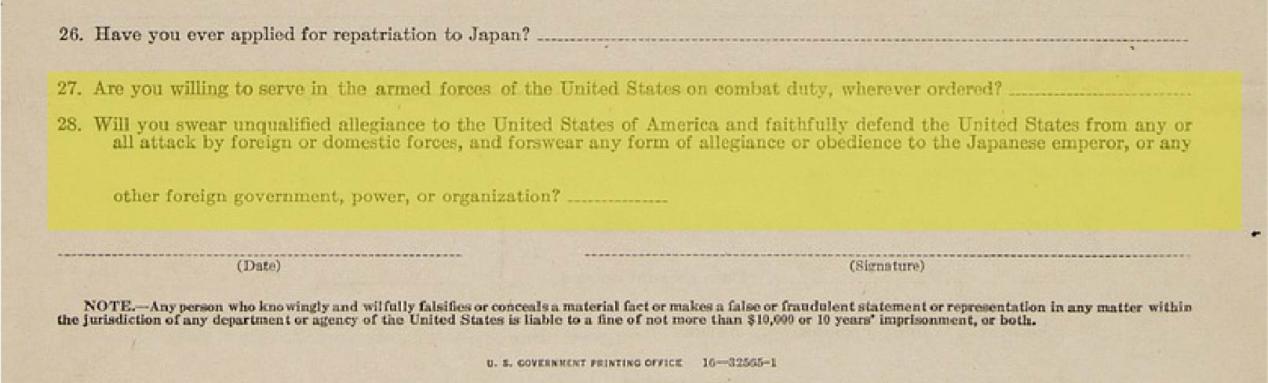 第28问:你是否誓言无条件效忠美国、忠实捍卫美国免于任何来自国内外的攻击,并且放弃对日本天皇或其他外国政府与组织任何形式的效忠?