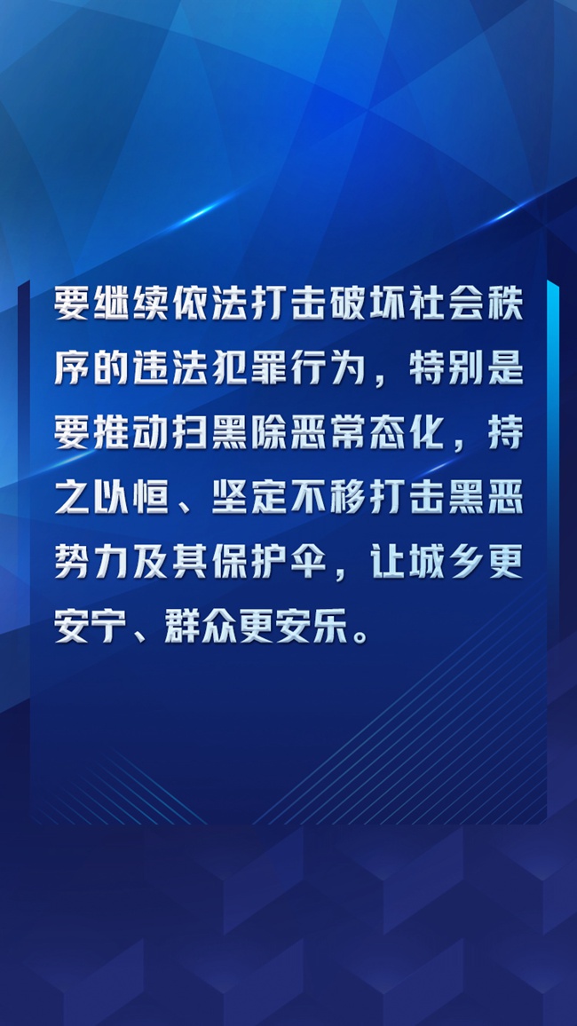 成就令人鼓舞,征途未有穷期。“十四五”规划和2035年远景目标纲要提出“推动扫黑除恶常态化”,这为根治黑恶顽疾提供了更加坚实的保障。要运用好宝贵经验,推进长效机制建设,打早打小、消除后患,常抓不懈、久久为功,坚决不让任何黑恶势力死灰复燃,彻底铲除黑恶势力滋生土壤。要发挥社会治安综合治理优势,在深入实际、掌握实情上下功夫,在把握规律、精准督导上下功夫,在依靠群众、发动群众上下功夫,推动各部门各司其职、齐抓共管,提高依法治理、系统治理、源头治理水平,努力建设更高水平的平安中国。