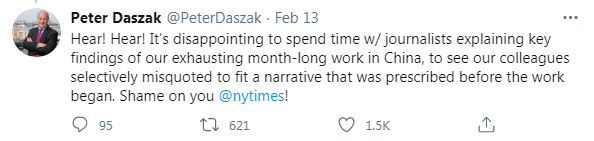 《纽约时报》2月12日曾刊文抹黑中国,声称援引近期赴武汉的世卫组织独立调查专家“说法”。报道立即遭多名专家公开驳斥,认为其报道“故意歪曲”“断章取义”,与事实不符。达萨克就是其中之一,他在社交媒体上怒斥《纽约时报》“无耻”。