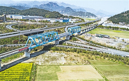3月31日,中铁二十二局集团四公司参建的金台铁路正式完工。该铁路是浙江第一条自主建设、自主运营的电气化铁路,全长约232公里,设计时速160公里,预计今年6月开通运营。图为金台铁路跨台金高速公路匝道特大桥。孔祥文摄(中经视觉)