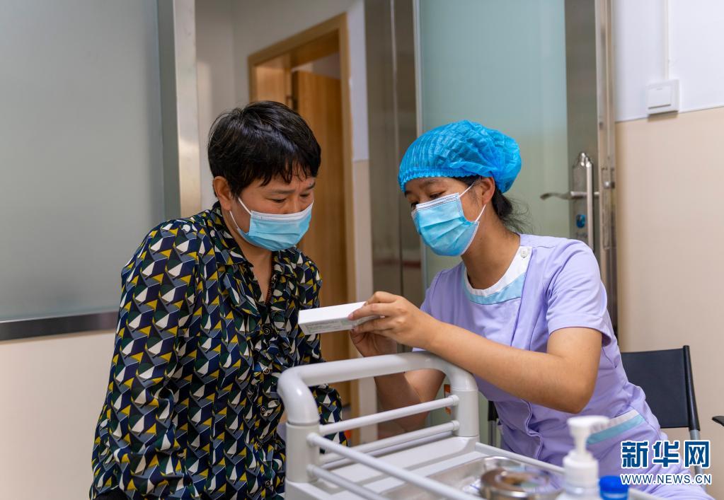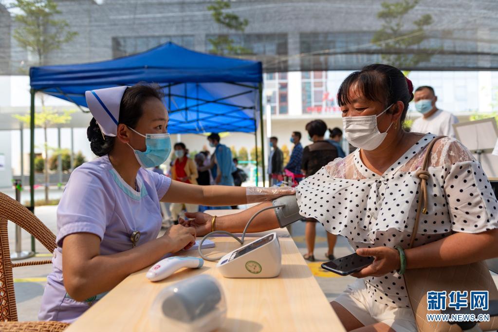 4月1日,一名女士在瑞丽市景成医院新冠疫苗接种点测量血压。