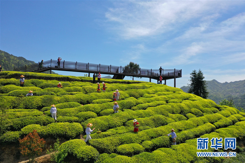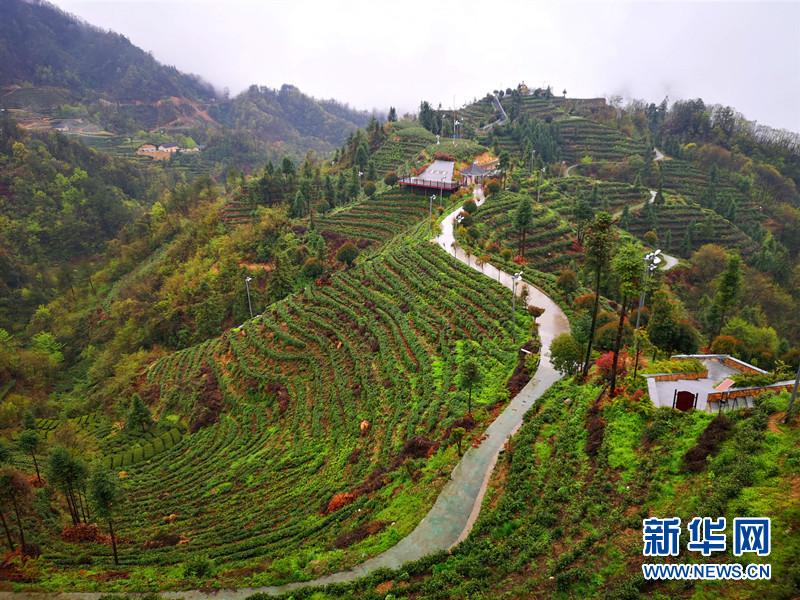 新华网武汉4月5日电(张潘)日前,“樱花又开放——疫后重振看湖北”全国网络媒体湖北行活动走进湖北省宜昌市三峡茶旅小镇。四月,三峡茶旅小镇万亩茶园吐新绿,云雾缭绕美不胜收。