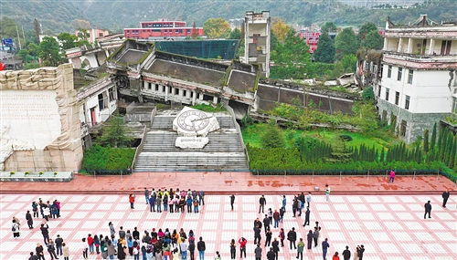 人们在四川省汶川县映秀镇四川汶川特大地震漩口中学遗址参观(二〇一九年十一月十二日无人机拍摄)。新华社记者 王建华摄