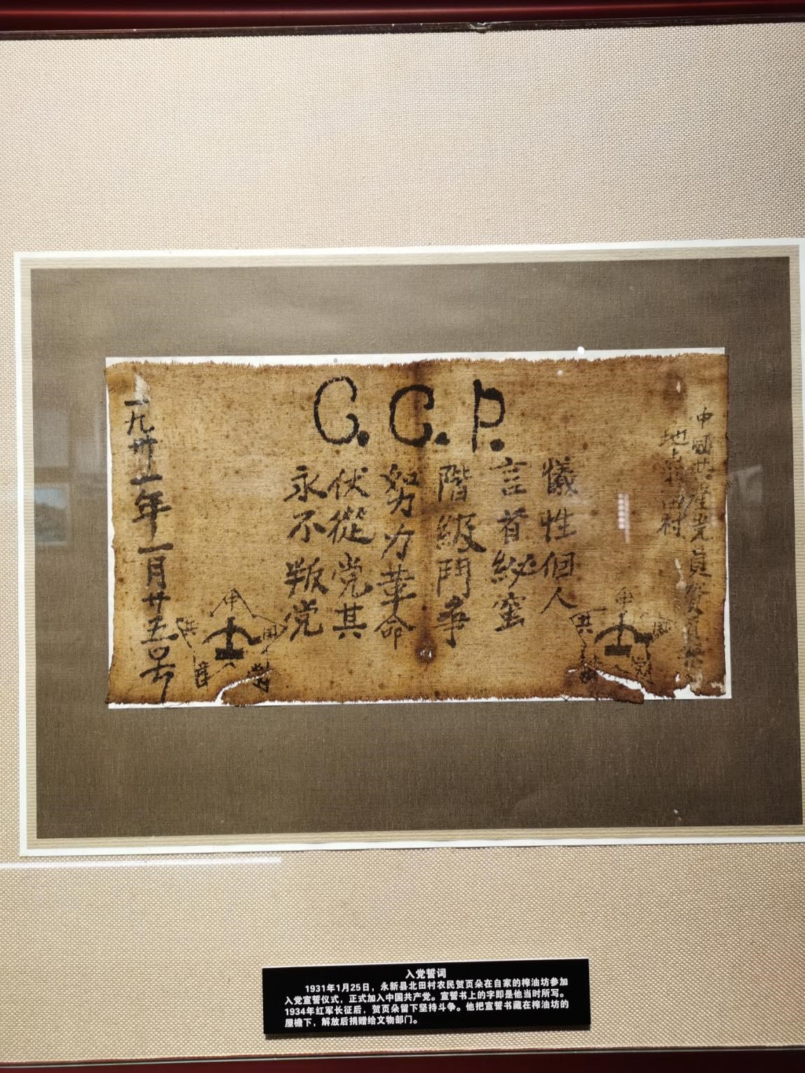 这份入党誓词,正是普通农民在争取翻身解放的艰难历程中坚定跟党走的历史见证。原件现收藏于中国国家博物馆,复制品在井冈山博物馆展出。