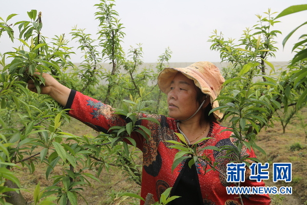 基地工人杨明英为李树抹芽(摄于3月31日)。新华网 蔡连素摄