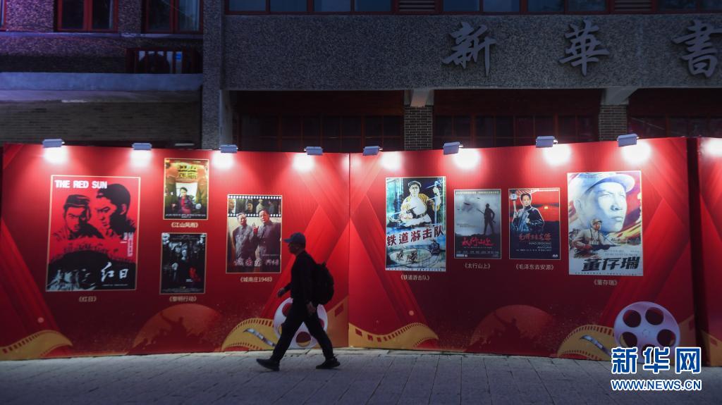 2021年4月2日拍摄的瓶窑古镇老街上展示的经典电影海报。当日,浙江省杭州市余杭区瓶窑古镇开启庆建党百年经典电影展映活动。