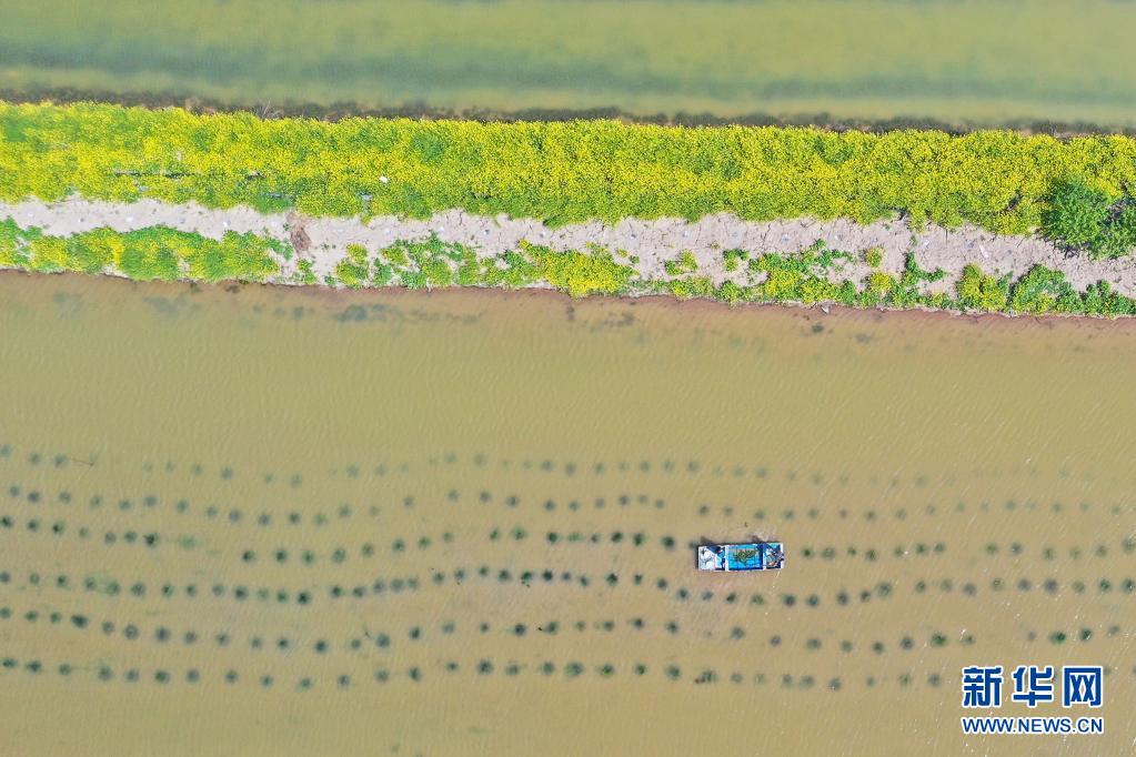 4月10日,泗洪县半城镇蟹农在蟹塘里栽植水草(无人机照片)。
