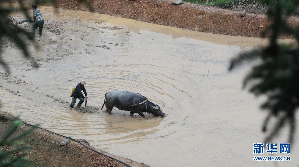 4月11日,贵州省黔东南苗族侗族自治州榕江县八开镇摆柳村村民在用耕牛耙田。