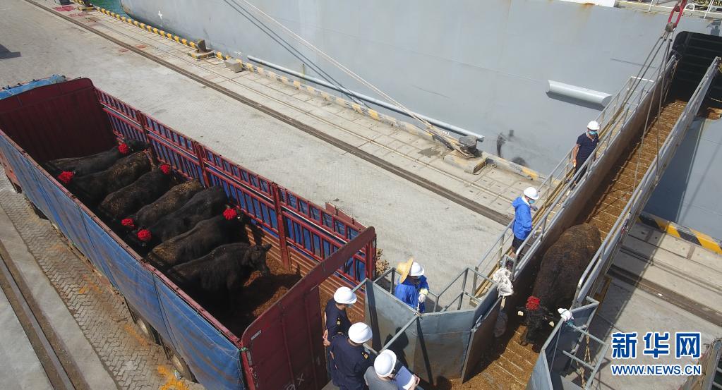 装载来自澳大利亚的进口活牛货船抵达海南马村港后,工作人员在接卸活牛(2020年7月3日摄,无人机照片)。新华社记者 杨冠宇 摄