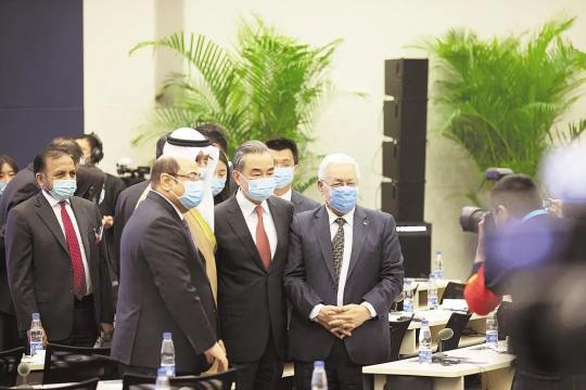 活动现场,外宾同国务委员兼外长王毅(中)合影。