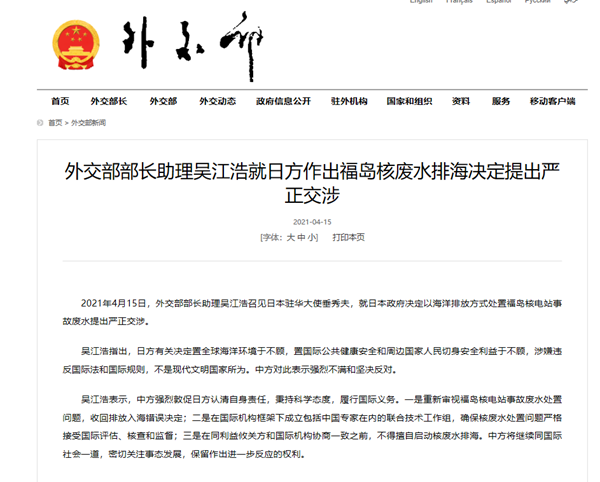 中国台湾网4月15日讯 据外交部官网消息, 2021年4月15日,外交部部长助理吴江浩召见日本驻华大使垂秀夫,就日本政府决定以海洋排放方式处置福岛核电站事故废水提出严正交涉。