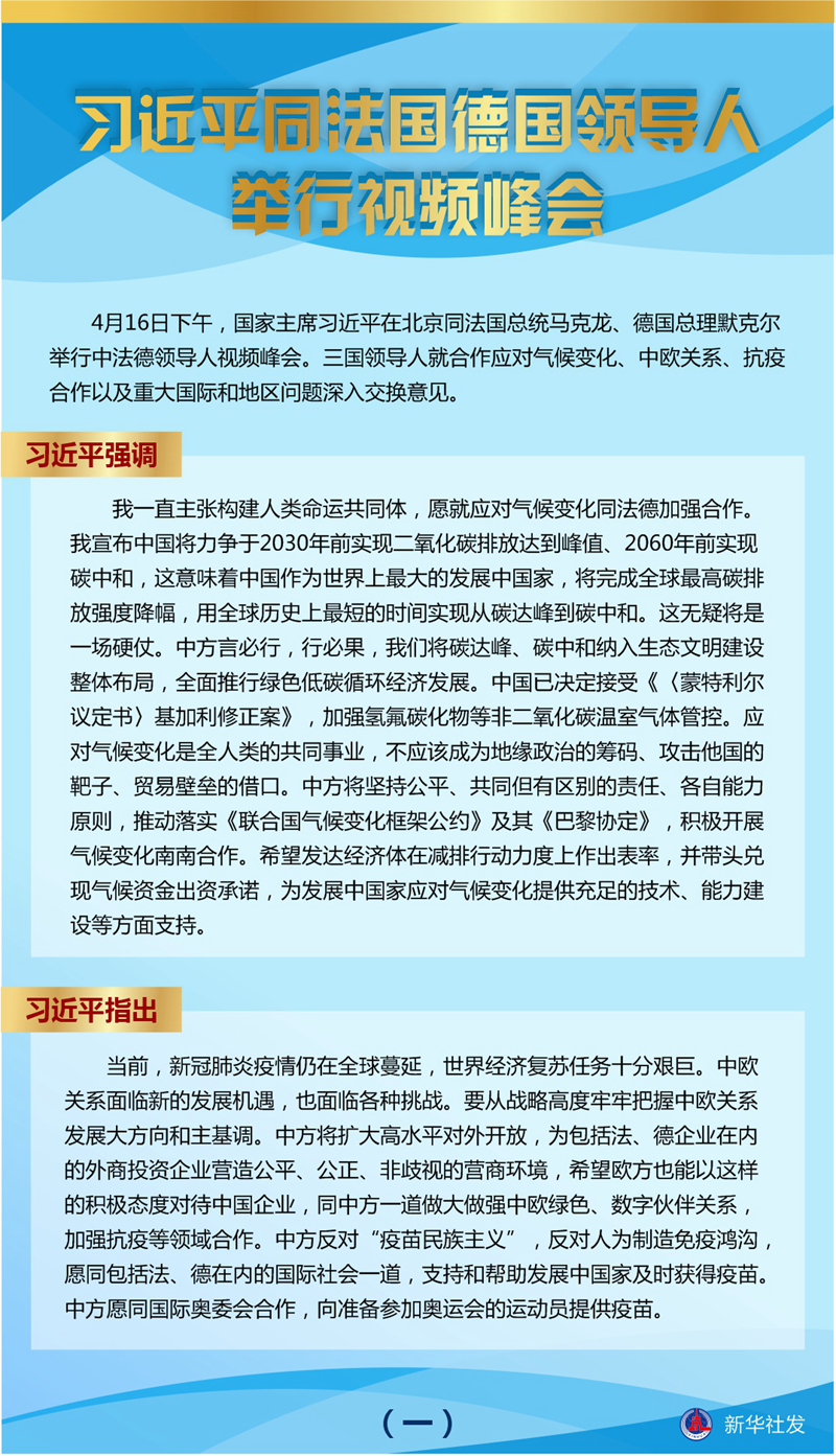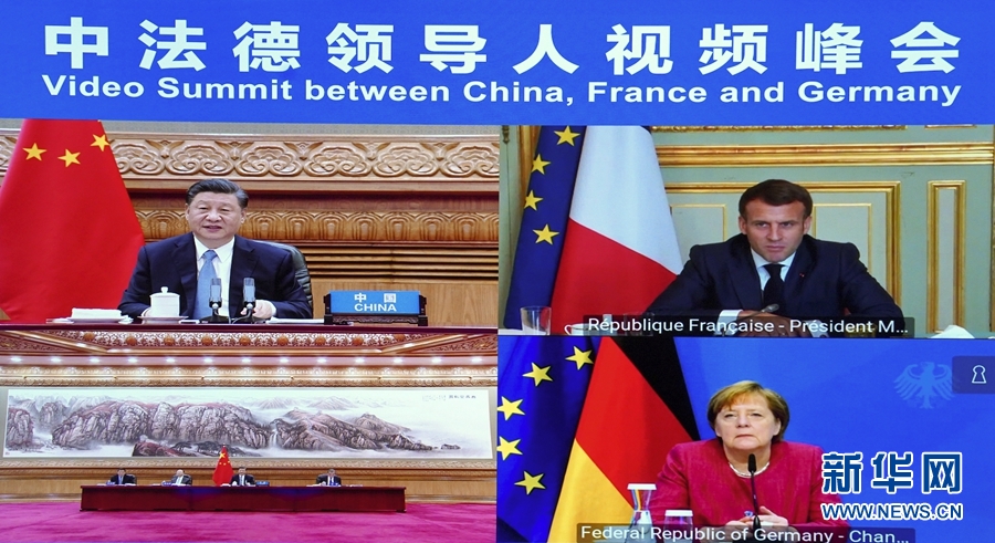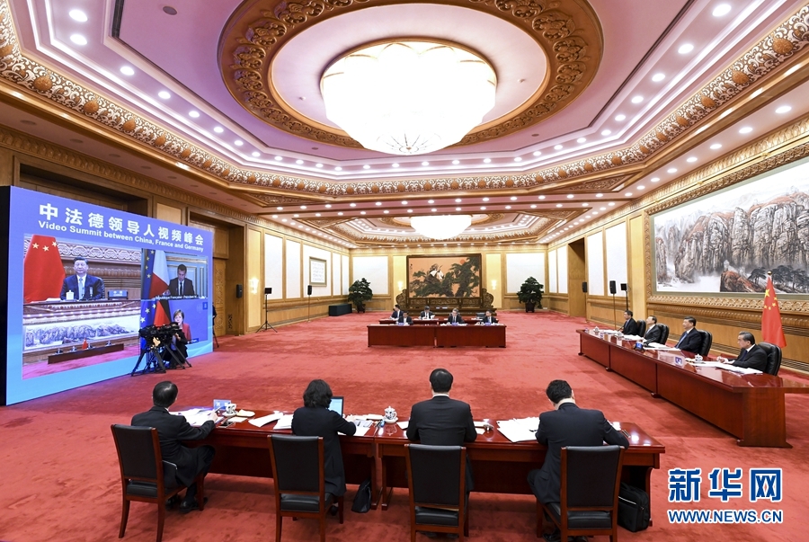 新华社北京4月16日电 4月16日下午,国家主席习近平在北京同法国总统马克龙、德国总理默克尔举行中法德领导人视频峰会。三国领导人就合作应对气候变化、中欧关系、抗疫合作以及重大国际和地区问题深入交换意见。