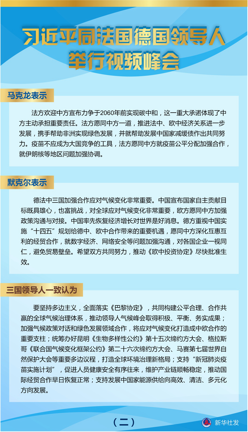 默克尔表示,德法中三国加强合作应对气候变化非常重要。中国宣布国家自主贡献目标既具雄心,也富挑战,对全球应对气候变化非常重要,欧方愿同中方加强政策沟通与对接。中国率先恢复经济增长对世界是好消息。德方重视中国实施“十四五”规划给德中、欧中合作带来的重要机遇,愿同中方深化互惠互利的经贸合作,就数字经济、网络安全等问题加强沟通,对各国企业一视同仁,避免贸易壁垒。希望双方共同努力,推动《欧中投资协定》尽快批准生效。