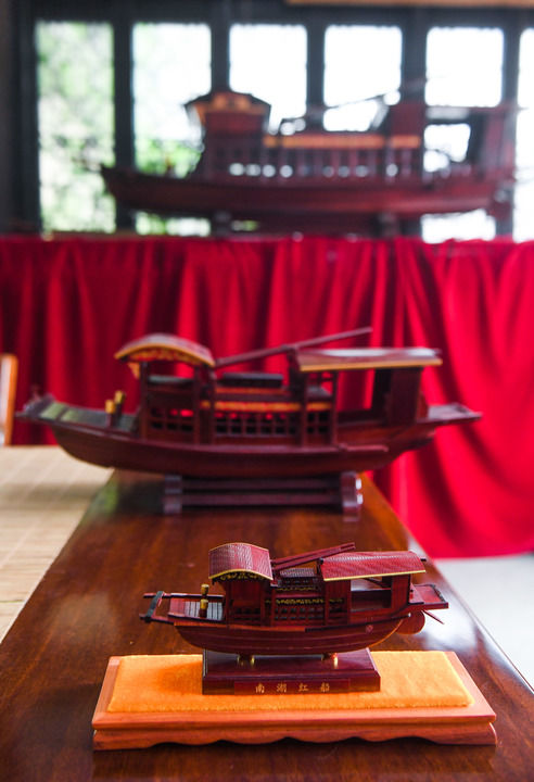 4月13日拍摄的不同尺寸的南湖红船模型。新华社记者徐昱摄
