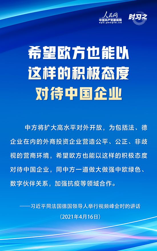 【编者按】4月16日下午,国家主席习近平在北京同法国总统马克龙、德国总理默克尔举行中法德领导人视频峰会。三国领导人就合作应对气候变化、中欧关系、抗疫合作以及重大国际和地区问题深入交换意见。人民网·中国共产党新闻网“时习之”栏目摘录了习近平在这次视频峰会上的重要讲话内容,一起学习。