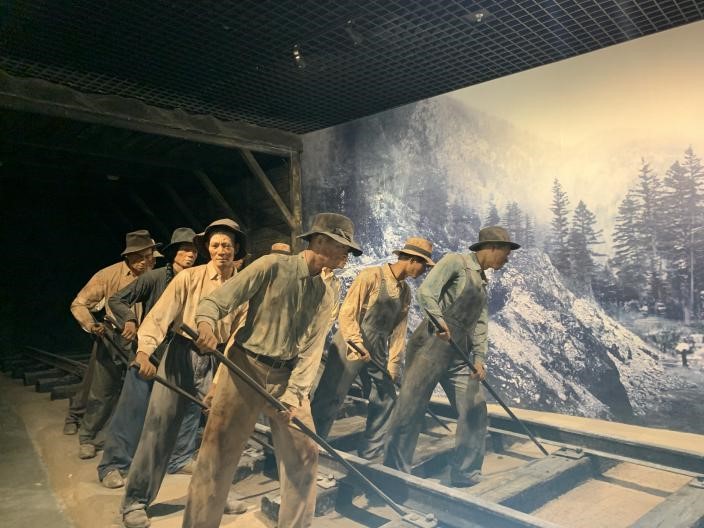 江门五邑华侨华人博物馆展出的美国华工群像雕塑。人民日报记者 吴姗摄