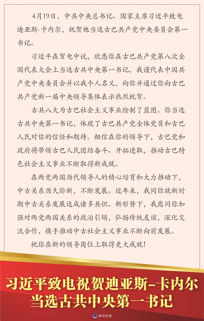 新华社北京4月20日电 4月19日,中共中央总书记、国家主席习近平致电迪亚斯-卡内尔,祝贺他当选古巴共产党中央委员会第一书记。