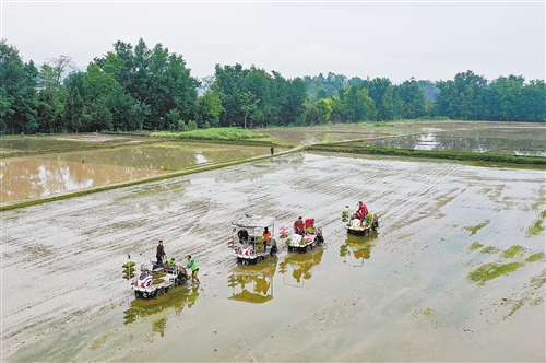 4月19日,四川省广安市邻水县裕东糯谷种植专业合作社农机员在用插秧机栽插糯谷秧苗。该合作社是一家农业生产全程机械化合作组织,专业从事粮食、蔬菜种植,2020年实现利润近150万元。邱海鹰摄(中经视觉)