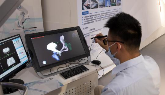 一名参观者正在体验VR手术规划系统。该系统可在虚拟现实环境下重建病灶部位的3D仿真模型,辅助外科医生制定手术方案。人民日报记者 朱笑熺、朱瑛琪摄