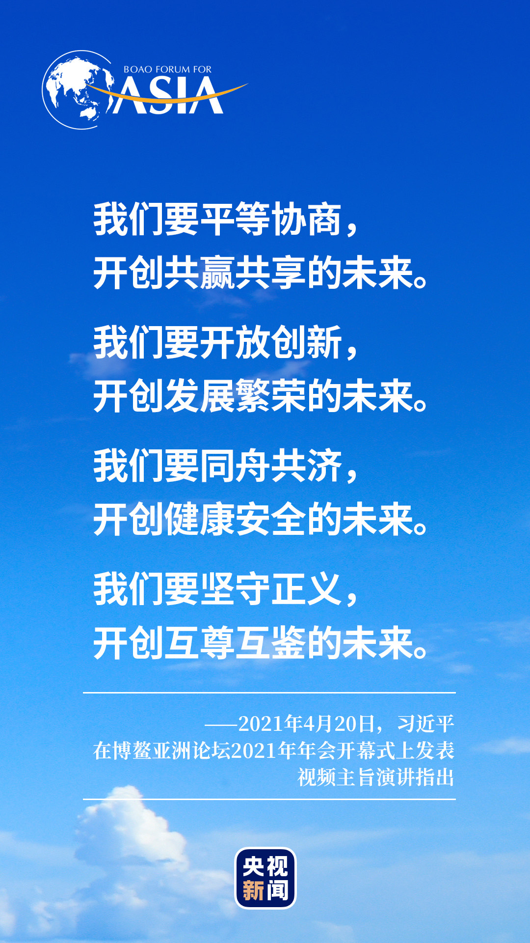 博鳌亚洲论坛2021年年会开幕式4月20日在海南博鳌举行,国家主席习近平以视频方式发表主旨演讲。这是习近平第五次在博鳌亚洲论坛年会开幕式上,向世界阐述中国主张。