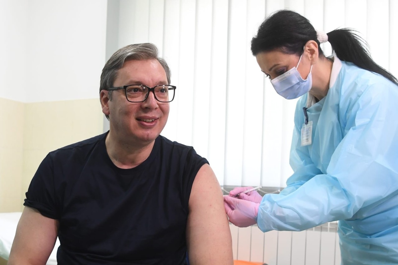 △当地时间2021年4月6日,塞尔维亚总统武契奇在马伊丹佩克市鲁德纳格拉瓦村卫生防疫站接种第一剂中国国药集团新冠灭活疫苗。武契奇在接种后表示:“感觉很棒。”
