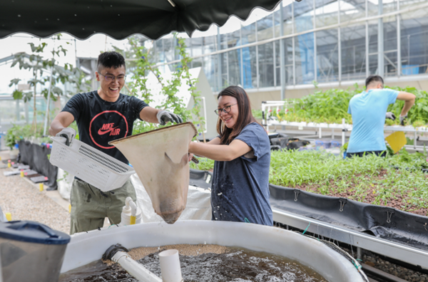 “养鱼不换水,种菜不施肥,这就是我们开发的‘鱼菜共生’系统,其本质是一个循环农业项目”。香港青年梁立峰是项目的创始人之一,他告诉记者,“鱼菜共生”的原理是在温室内通过水处理系统,将集约式养鱼所产生的富营养水体,转化成为蔬菜可以吸收的营养,从而种植有机水培蔬菜。“所有的蔬菜都是零农残,因为一旦施了农药和化肥,鱼儿就死了,”梁立峰说。
